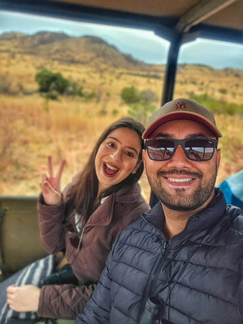 Chegamos em Joanesburgo por volta das 7h30 da manhã. Depois de passar pela imigração (sem problemas!) e pegar as malas, fomos buscar nossa van no estacionamento do aeroporto. É bom lembrar: na África do Sul a direção é na mão inglesa, ou seja, do lado esquerdo da pista – pode assustar no começo, mas depois de alguns quilômetros vira diversão! 🚐