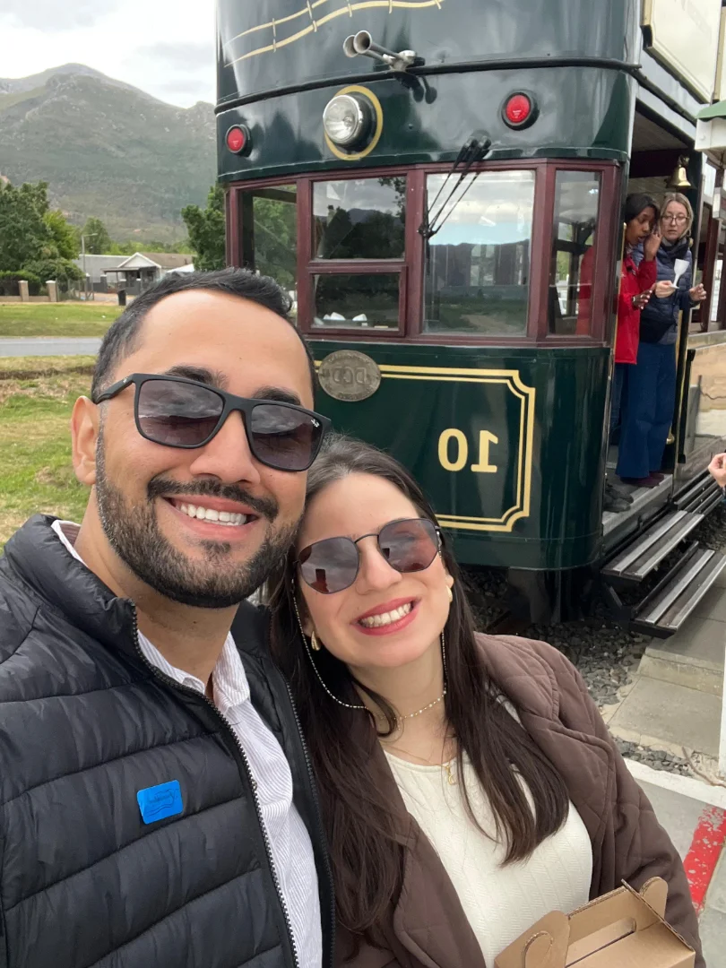 Fizemos o famoso Franschhoek Wine Tram (linha azul) — um passeio de trem pelas vinícolas da região.